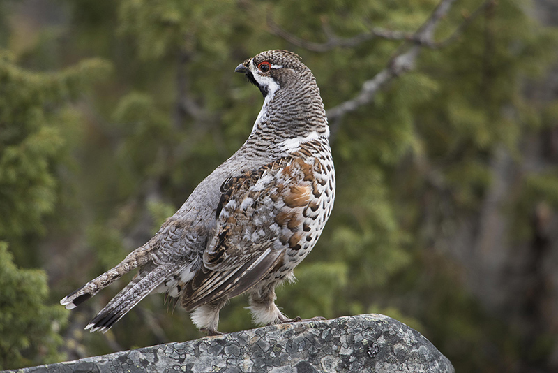 Auerhoenders lopen langs de snelweg, waar eens in het kwartier een auto passeert. We worden wakker tussen de bolderende korhoenders.