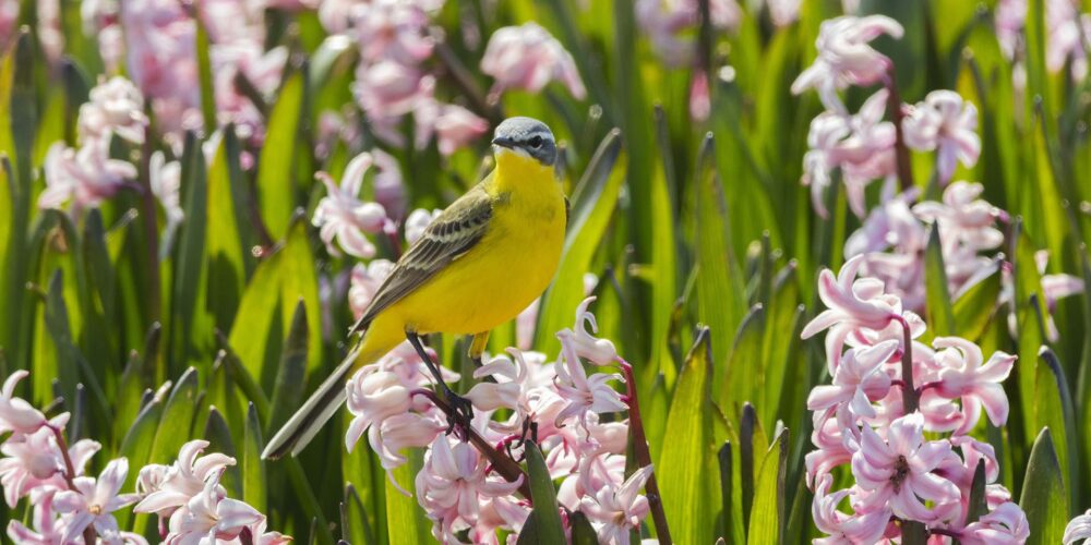 Een gele kwikstaart op bolbloemen.