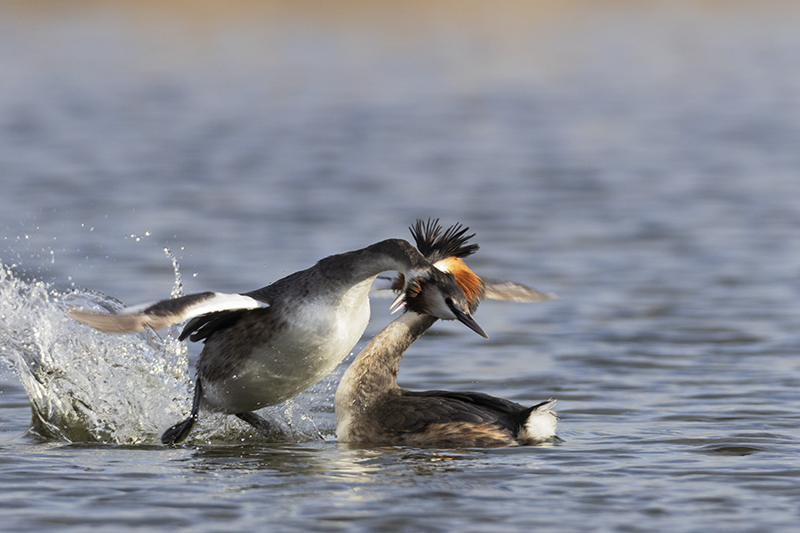 We zijn midden maart al gepasseerd, de lente kondigt zich op alle fronten aan. Zo ook in de vogelwereld. Diverse zomergasten keren terug of zijn al teruggekeerd uit hun winterverblijf en laten van zich horen om een territorium te claimen of een partner te lokken. Andere vogels zijn al een stap verder en zijn druk aan het baltsen. Bijvoorbeeld de fuut. Hoewel in deze periode van het jaar nog niet elke fuut in volledig prachtkleed is weerhoudt dat hen niet om een potentiële partner ervan te overtuigen dat hij/zij de beste keus is. Op een plaats waar meerdere stelletjes futen aanwezig zijn wordt er een waar theaterstuk ten tonele gebracht. De mannetjes doen hun uiterste best om een leuke vrouw te versieren. Dit doen ze door opvallend rond te zwemmen in hun zojuist geclaimde territorium. Futen zijn buiten de broedtijd redelijk zwijgzaam maar nu laten ze zich horen. Een krachtig rollend “geknor”. Vervolgens worden er diverse rituelen uitgevoerd door het zojuist gevormde paar. Het synchroon kopschudden, het admiraalzeilen, en vervolgens de pinguïndans. Als dit laatste wordt uitgevoerd laten beide partners zich onder water zakken om daarna met plantresten in hun bek weer boven water te komen. Ze komen “watertrappelend “ uit het water, steeds hoger waarbij ze elkaar in de ogen blijven kijken. Daarna zakken ze terug het kopschudden volhoudend. Daarna kan de paring plaatsvinden. Het territorium wordt flink verdedigd, indringers wordt duidelijk gemaakt dat ze moeten ophoepelen. Dit door middel van dreighoudingen maar er wordt soms ook flink gevochten als de indringer niet op het dreigen reageert.