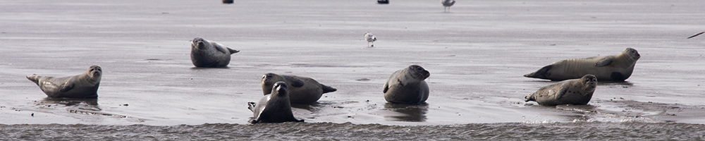 Als gevolg van de oostenwind was het water echter niet erg hoog, veel platen waren niet kopje onder zodat grote wolken bonte strandlopers, rosse grutto’s etc ontbraken. Die konden doorgaan met foerageren met deze waterstand. Zoals bekend: elk nadeel heb zijn voordeel: omdat de platen niet volledig onder water waren verdwenen konden we de aanwezigheid vaststellen van 26 zeehonden. Die gaan graag rusten op een niet onder water staande bank.