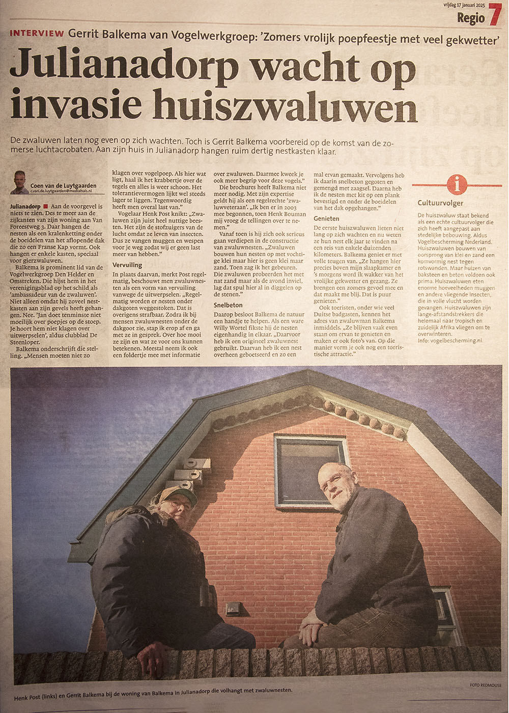 Gerrit Balkema is klaar om de huiszwaluwen, welke dit voorjaar terugkomen uit Afrika, te ontvangen. In de Helderse Krant van vrijdag 17 januari j.l. verscheen een interview met Gerrit, ook Henk Post was van de partij. Lees hieronder het artikel.